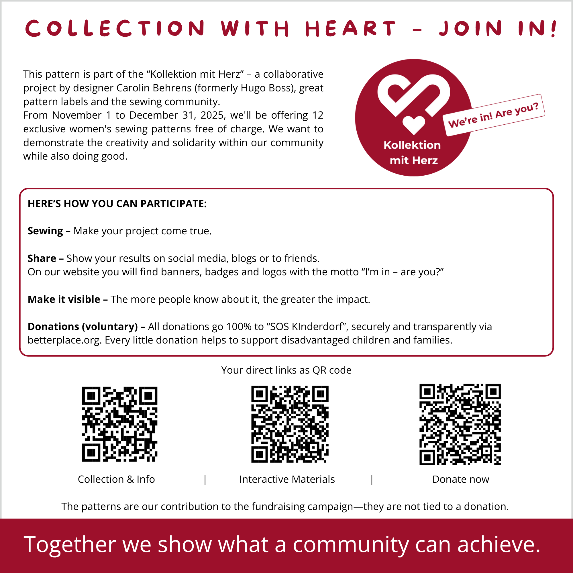 Sewing for a good cause – doing good together. From November 1 to December 31, 2025, 12 exclusive patterns will be available to you free of charge as part of the“Collection with a heart” initiative.