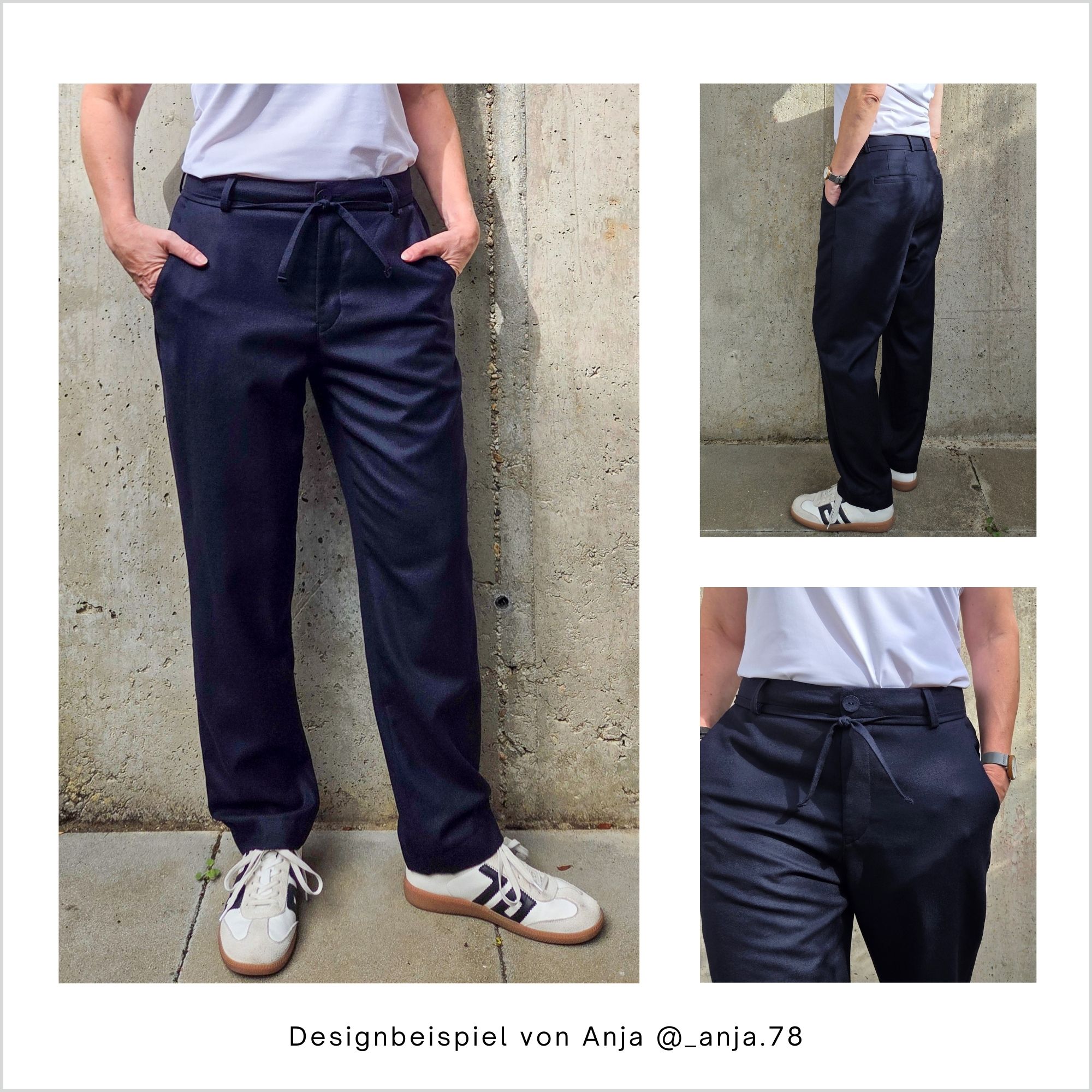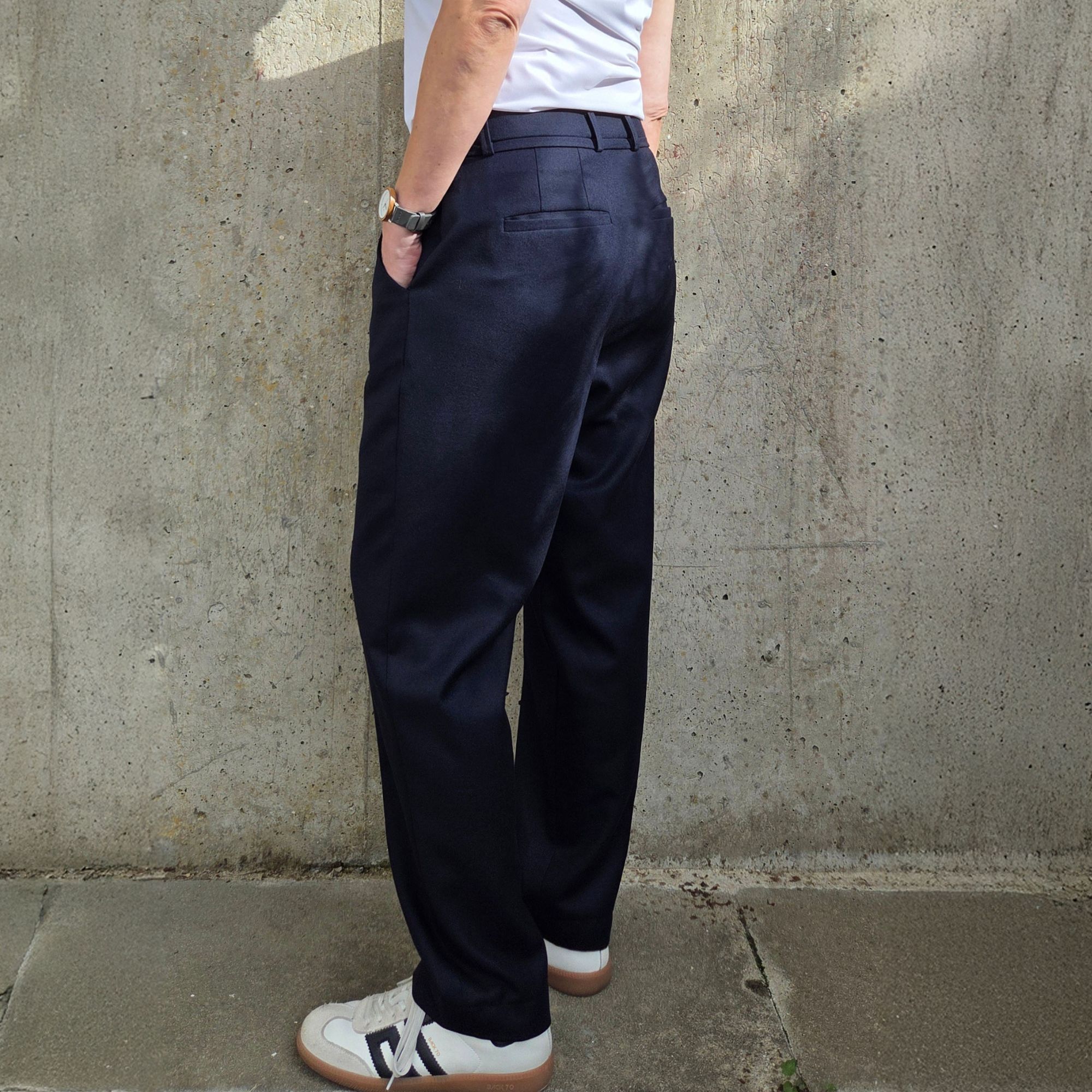 Vorne gibt es abgerundete Taschen in der sogenannten “banana-Form” und hinten klassische Paspeltaschen mit 12 mm breiten Paspeln. Der 4 cm hohe Formbund sorgt für guten Sitz und optimalen Halt. Der vordere Schlitz wird mit einem Reißverschluss gearbeitet.