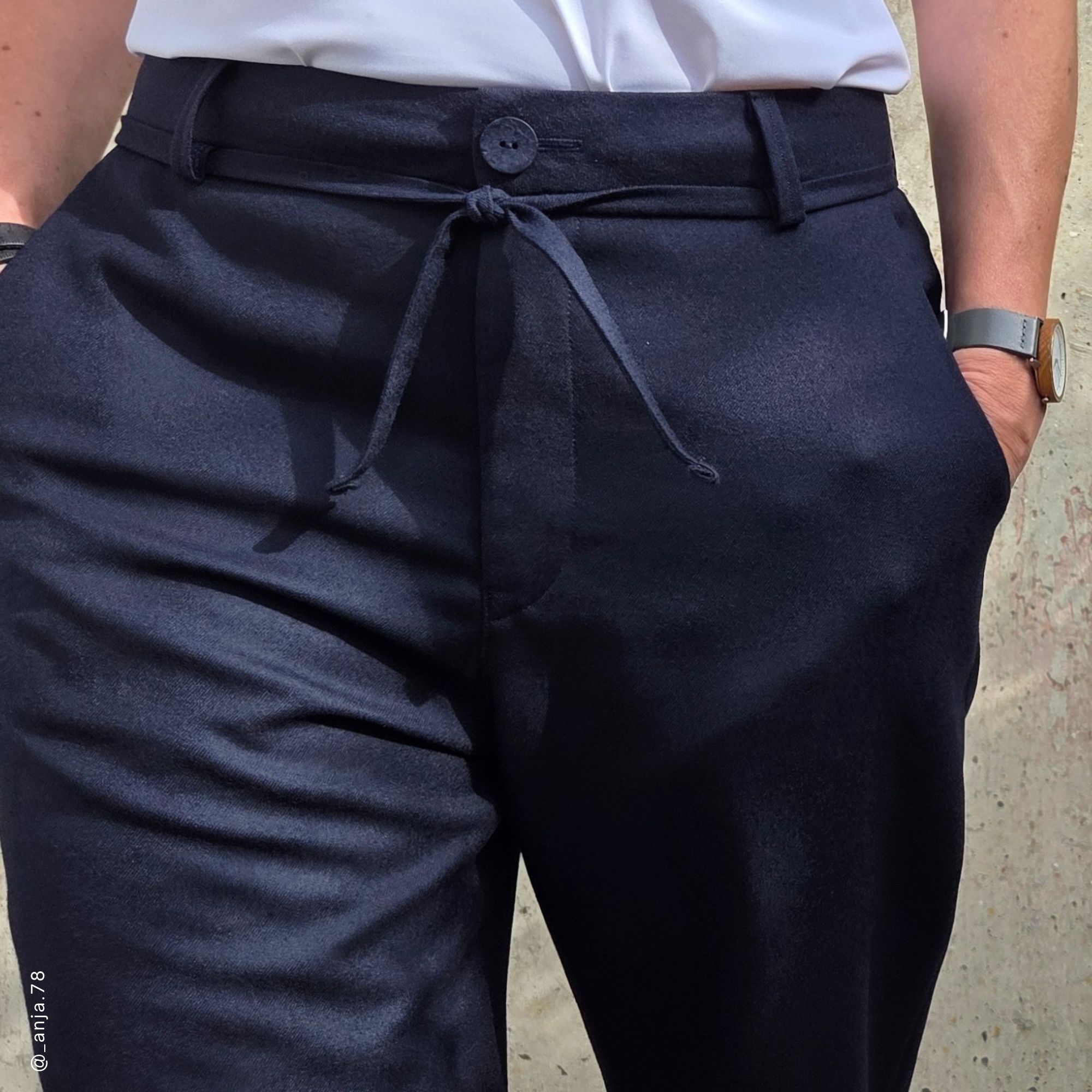 Die Chino ist grundsätzlich für unelastische Stoffe konzipiert. Wenn du ein leicht elastisches Material verwenden möchtest, musst du dafür sorgen, dass der Bund nicht ausdehnt, indem du ihn mit einer geeigneten Einlage fixierst.