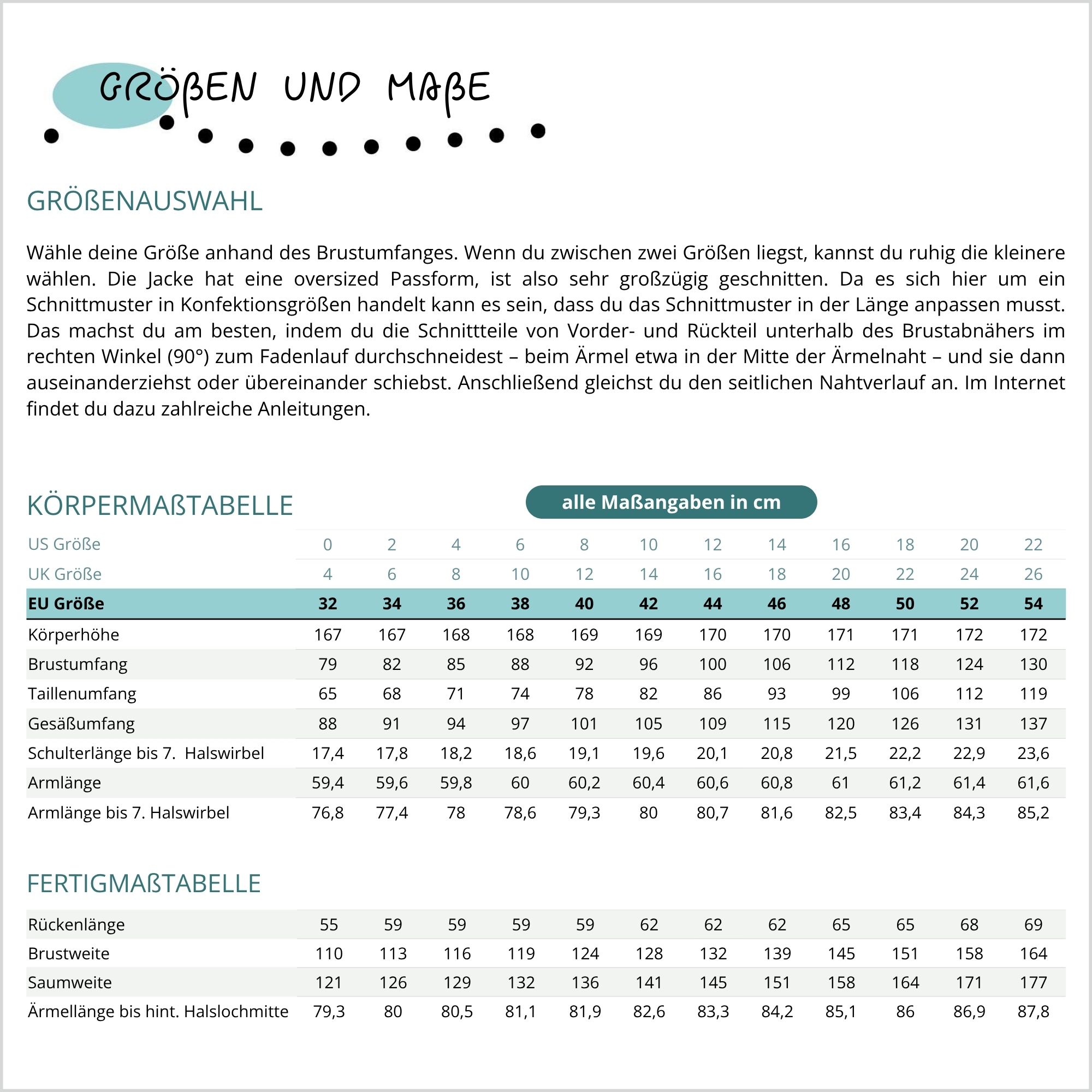 Unten findest du eine ausführliche Körpermaßtabelle, die diesem Schnittmuster zugrunde liegt. Vergleiche die Maße mit deinen eigenen und wähle so die passende Größe. Weitere Infos dazu findest du in der Anleitung.