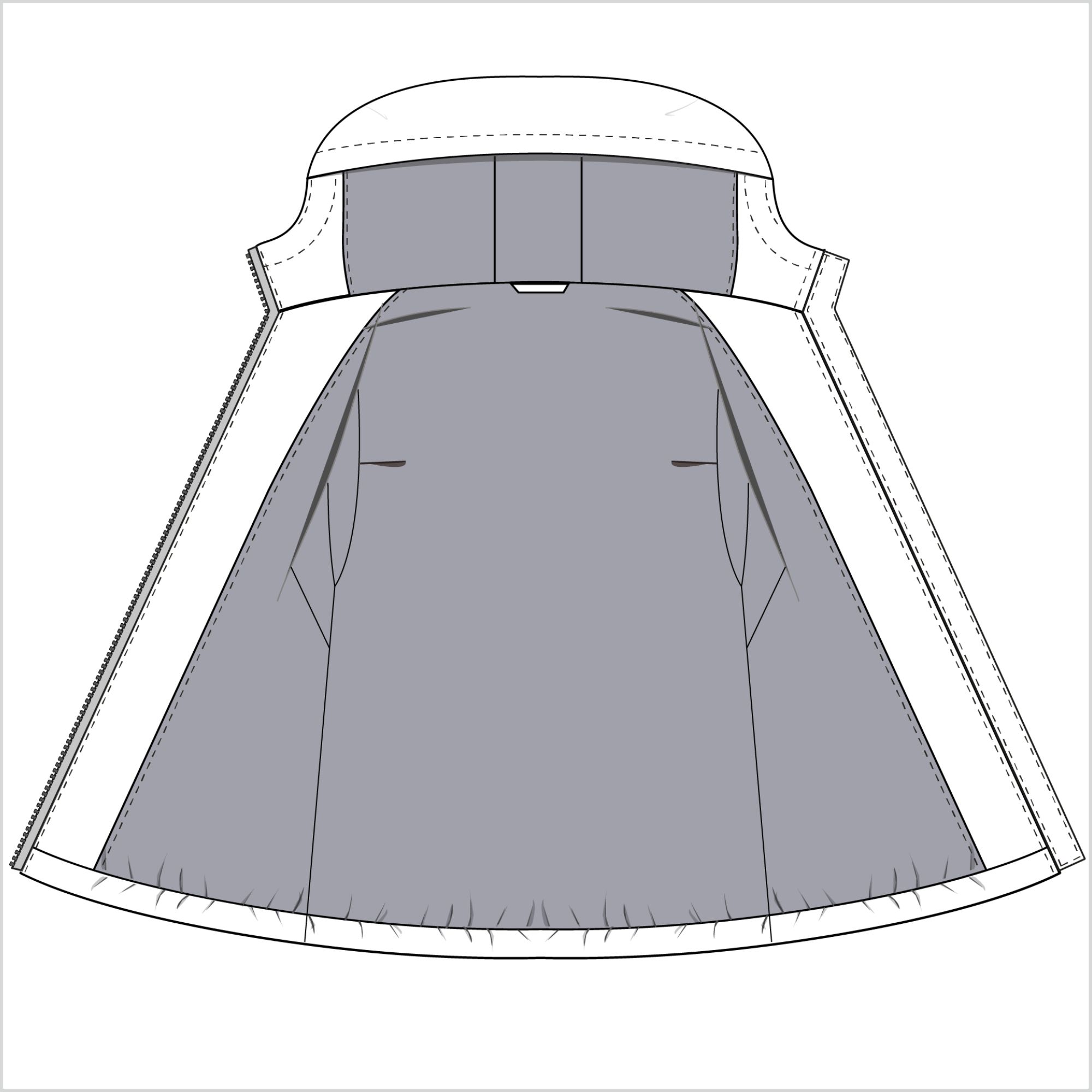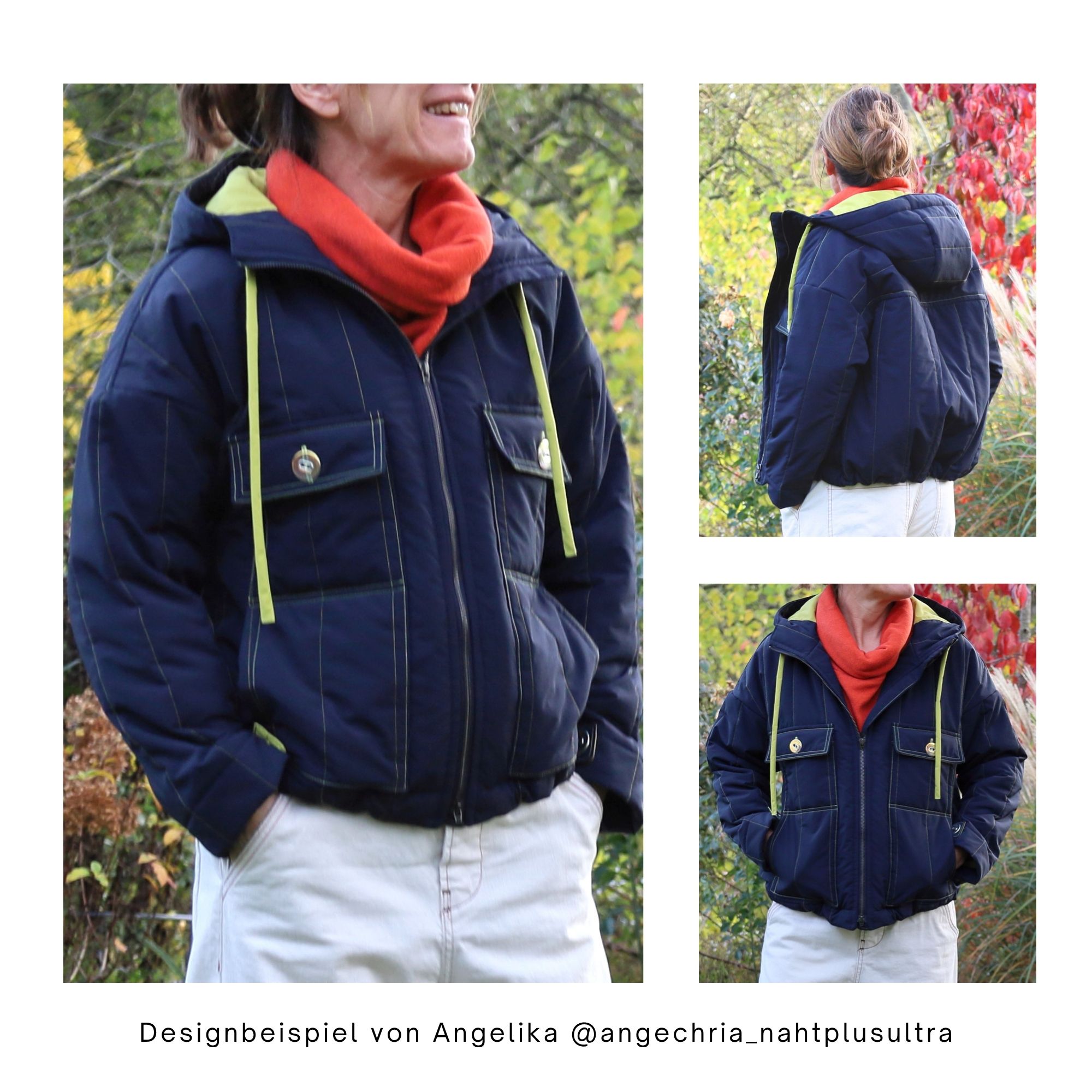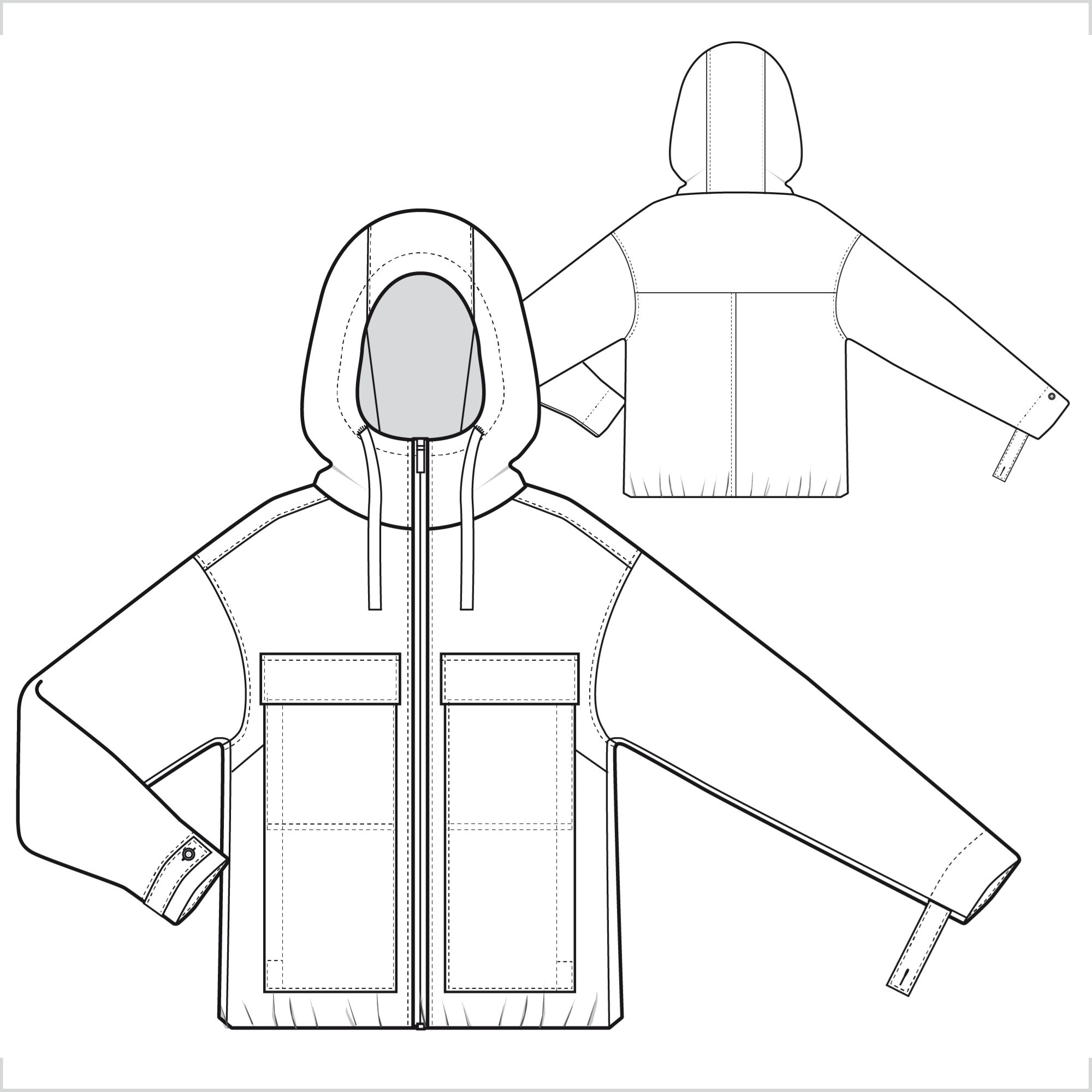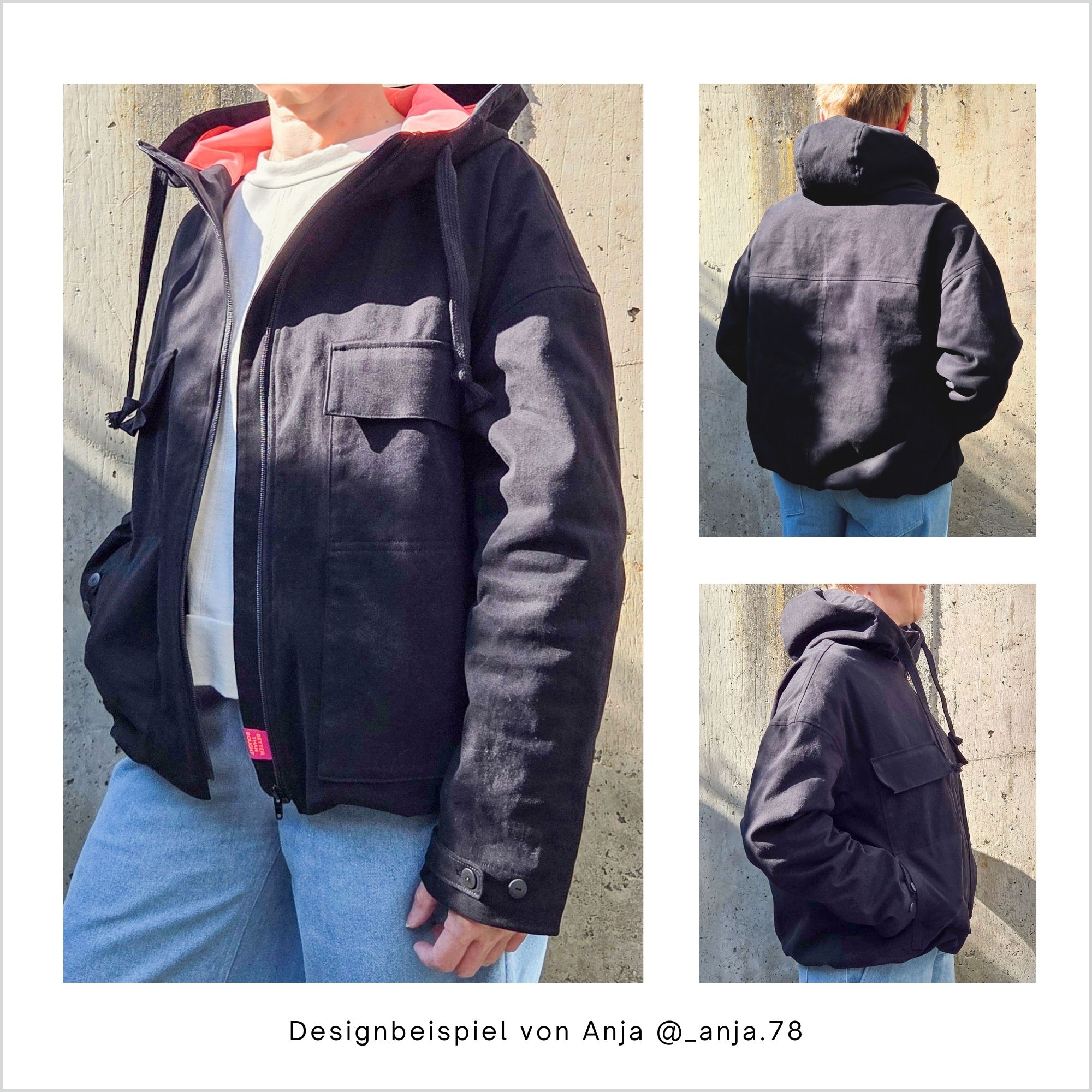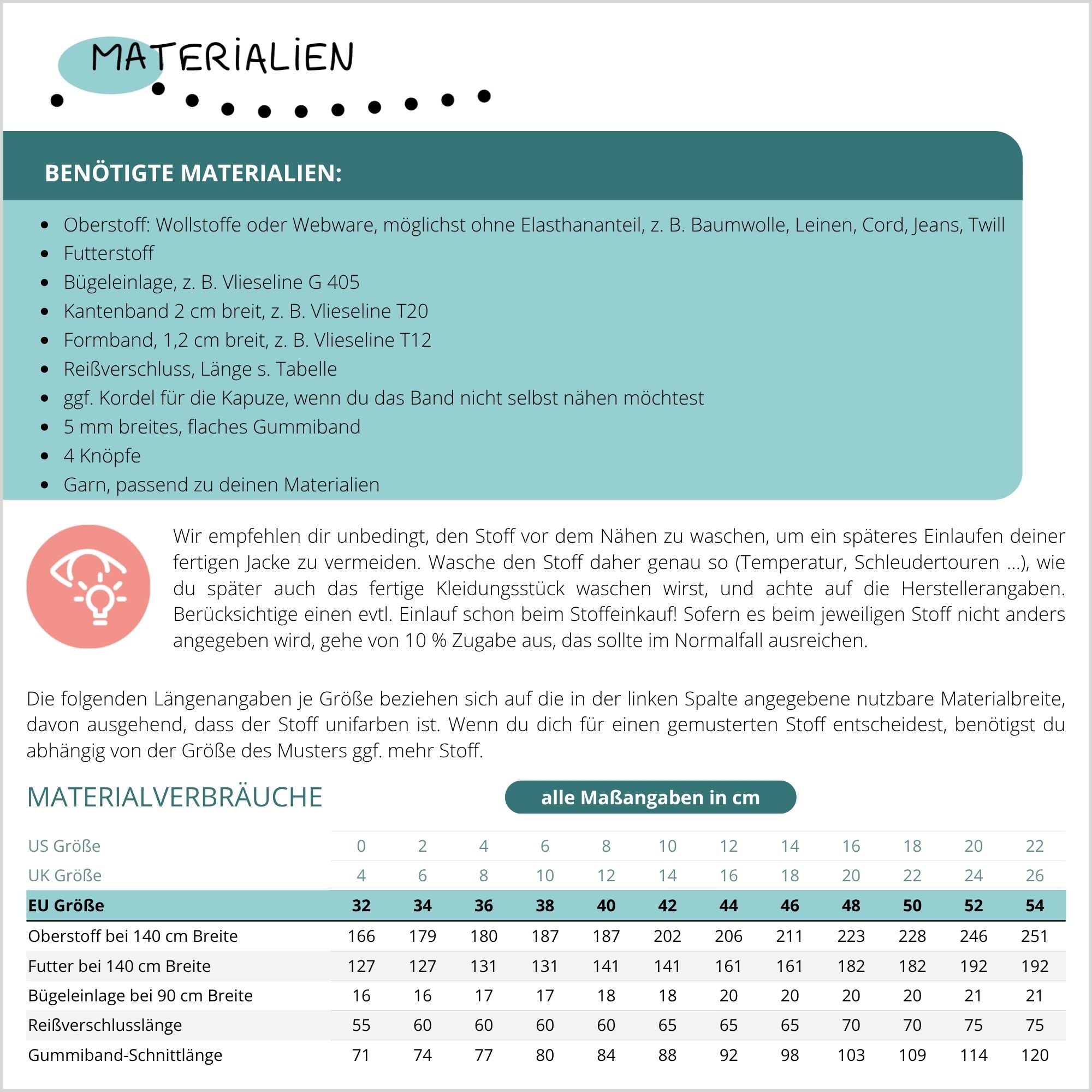 Die Jacke mit Kapuze ist für nicht dehnbare Stoffe konzipiert, z. B. Wollstoffe, Softshell, Denim, Twill, Gabardine …